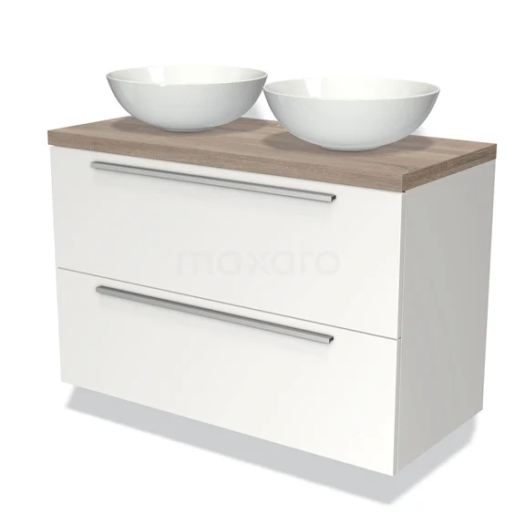 Modulo Plato Badmöbel mit Aufsatzwaschbecken | 100 cm Matt Weiß Flach front Eiche blatt 2 übereinanderliegende Schubladen