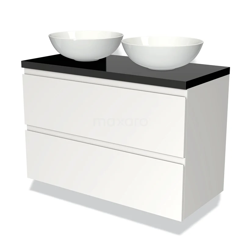 Modulo Plato Badmöbel mit Aufsatzwaschbecken | 100 cm Matt Weiß Grifflos front Hochglanz Schwarz blatt 2 übereinanderliegende Schubladen