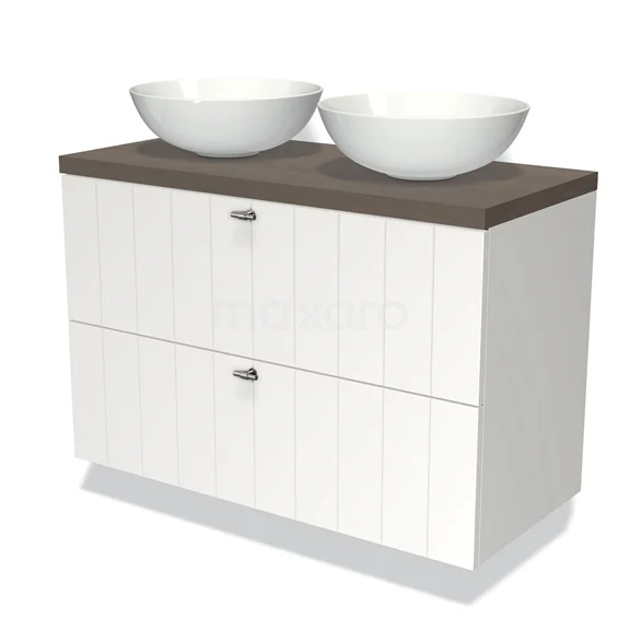 Modulo Plato Badmöbel mit Aufsatzwaschbecken | 100 cm Matt Weiß Lamelle front Dunkelbraune Eiche blatt 2 übereinanderliegende Schubladen
