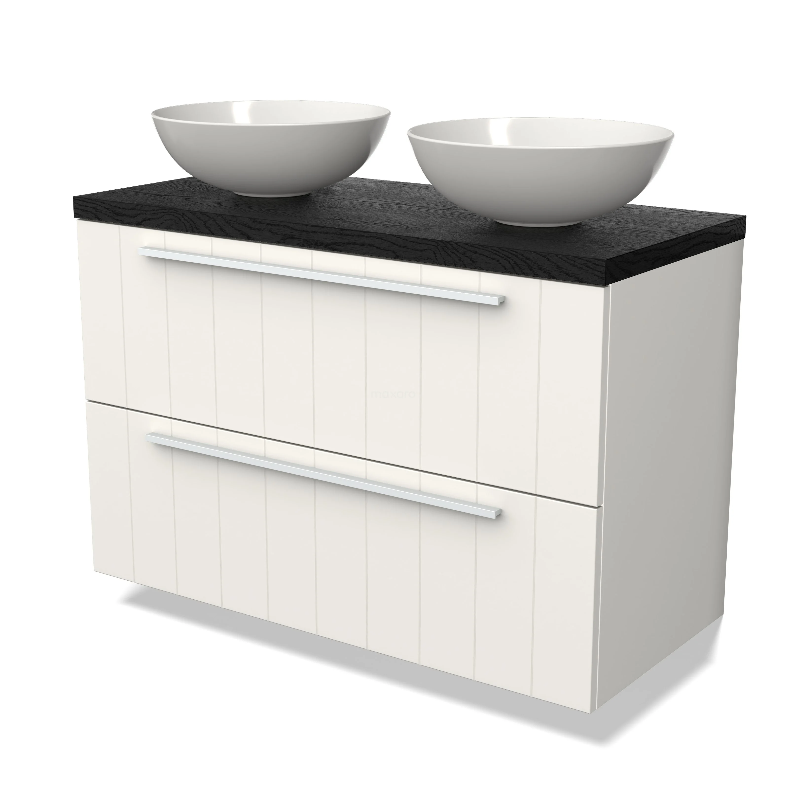 Weißes Badezimmermöbel mit zwei Schubladen, schwarzer Platte und zwei runden Aufsatzwaschbecken, ideal für ein stilvolles modernes Badezimmer.