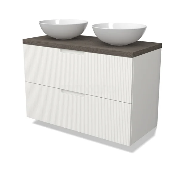 Modulo Plato Badmöbel mit Aufsatzwaschbecken | 100 cm Matt Weiß Linie front Dunkelbraune Eiche blatt 2 übereinanderliegende Schubladen