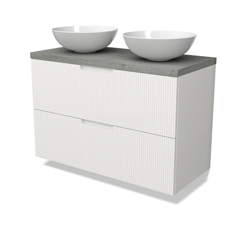 Modulo Plato Badmöbel mit Aufsatzwaschbecken | 100 cm Matt Weiß Linie front Graue Eiche blatt 2 übereinanderliegende Schubladen