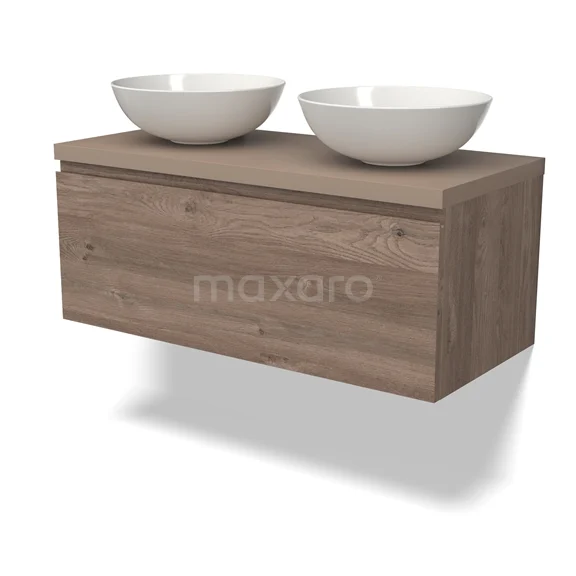 Modulo Plato Badmöbel mit Aufsatzwaschbecken | 100 cm Mittelbraune Eiche Grifflos front Taupe blatt 1 Schublade