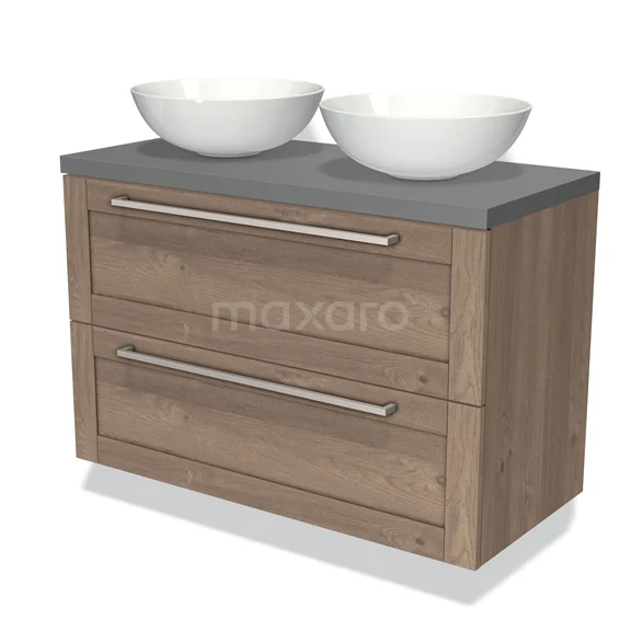 Modulo Plato Badmöbel mit Aufsatzwaschbecken | 100 cm Mittelbraune Eiche Rahmen front Mittelgrau blatt 2 übereinanderliegende Schubladen
