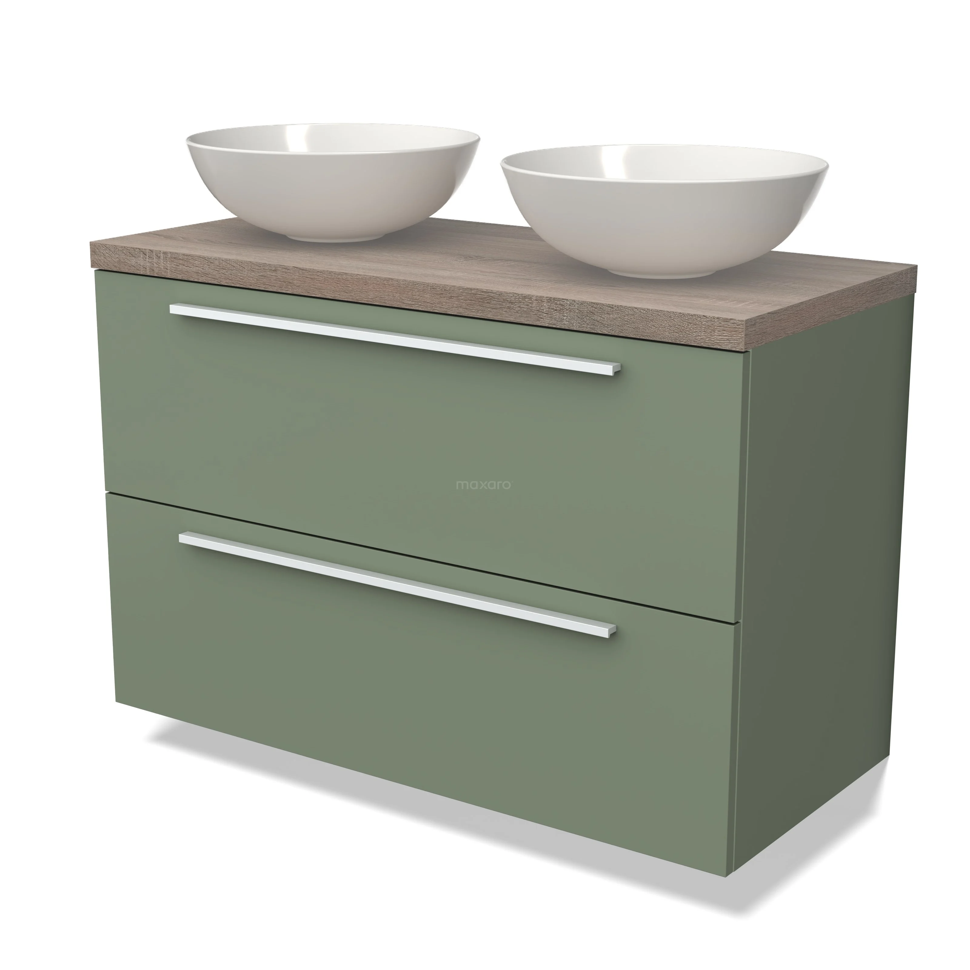 Modulo Plato Badmöbel mit Aufsatzwaschbecken | 100 cm Salbeigrün Flach front Eiche blatt 2 übereinanderliegende Schubladen