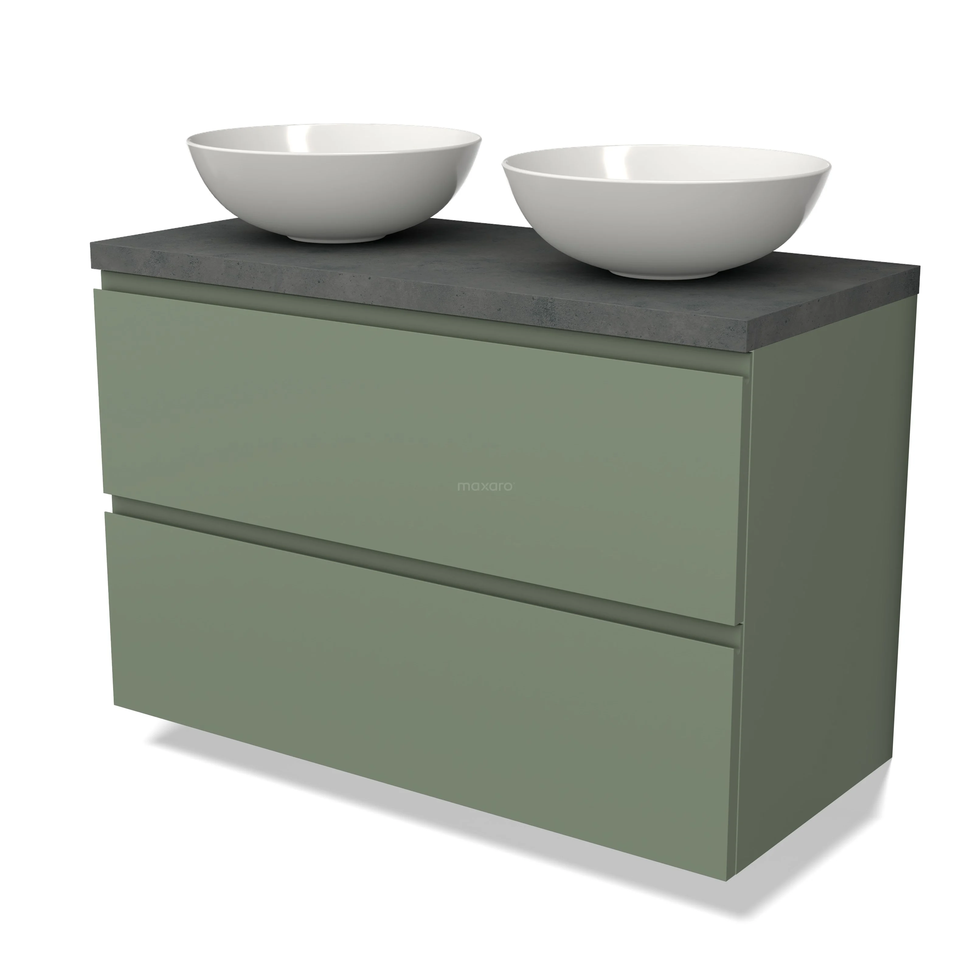Modulo Plato Badmöbel mit Aufsatzwaschbecken | 100 cm Salbeigrün Grifflos front Dunkelgrauer Beton blatt 2 übereinanderliegende Schubladen