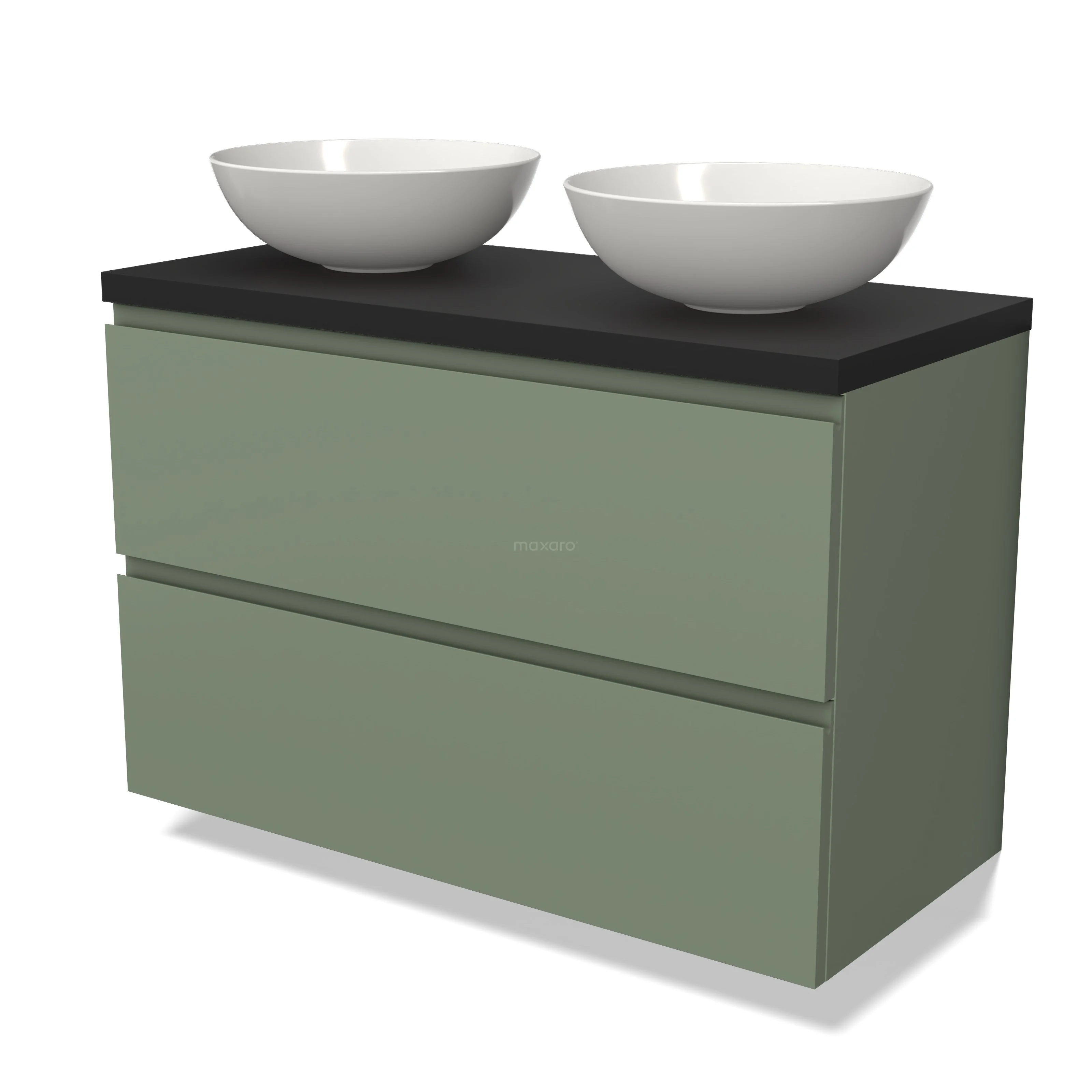 Modulo Plato Badmöbel mit Aufsatzwaschbecken | 100 cm Salbeigrün Grifflos front Matt Schwarz blatt 2 übereinanderliegende Schubladen