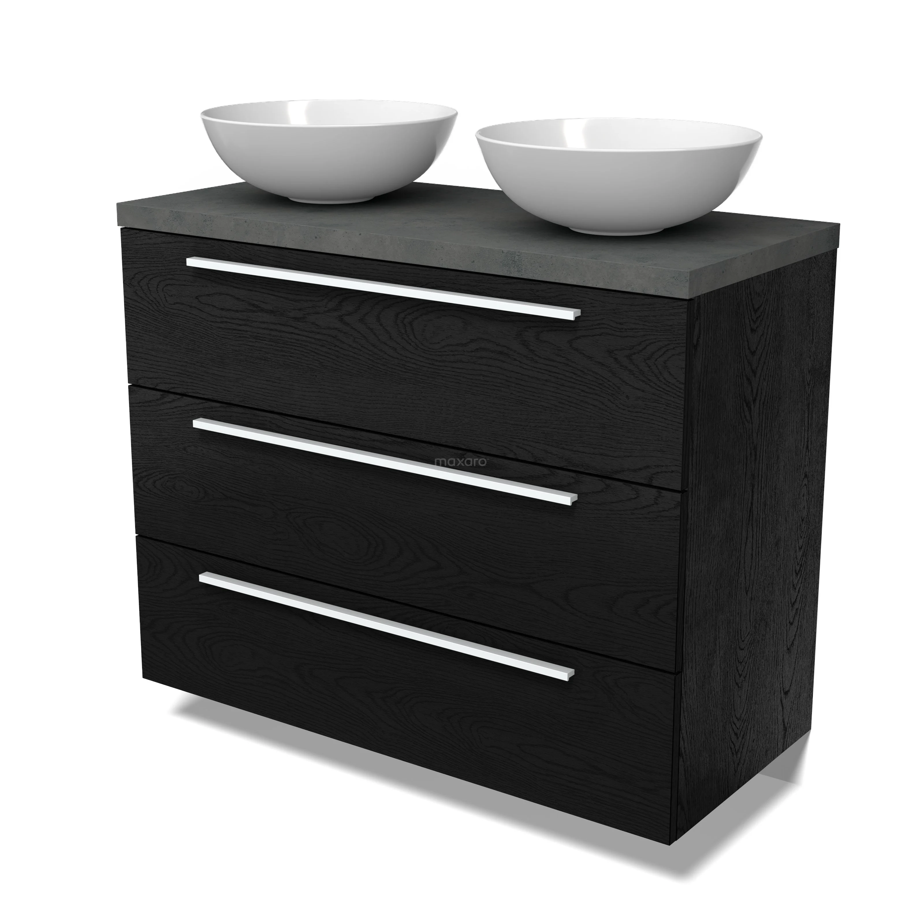 Modulo Plato Badmöbel mit Aufsatzwaschbecken | 100 cm Schwarze Eiche Flach front Dunkelgrauer Beton blatt 3 Schubladen