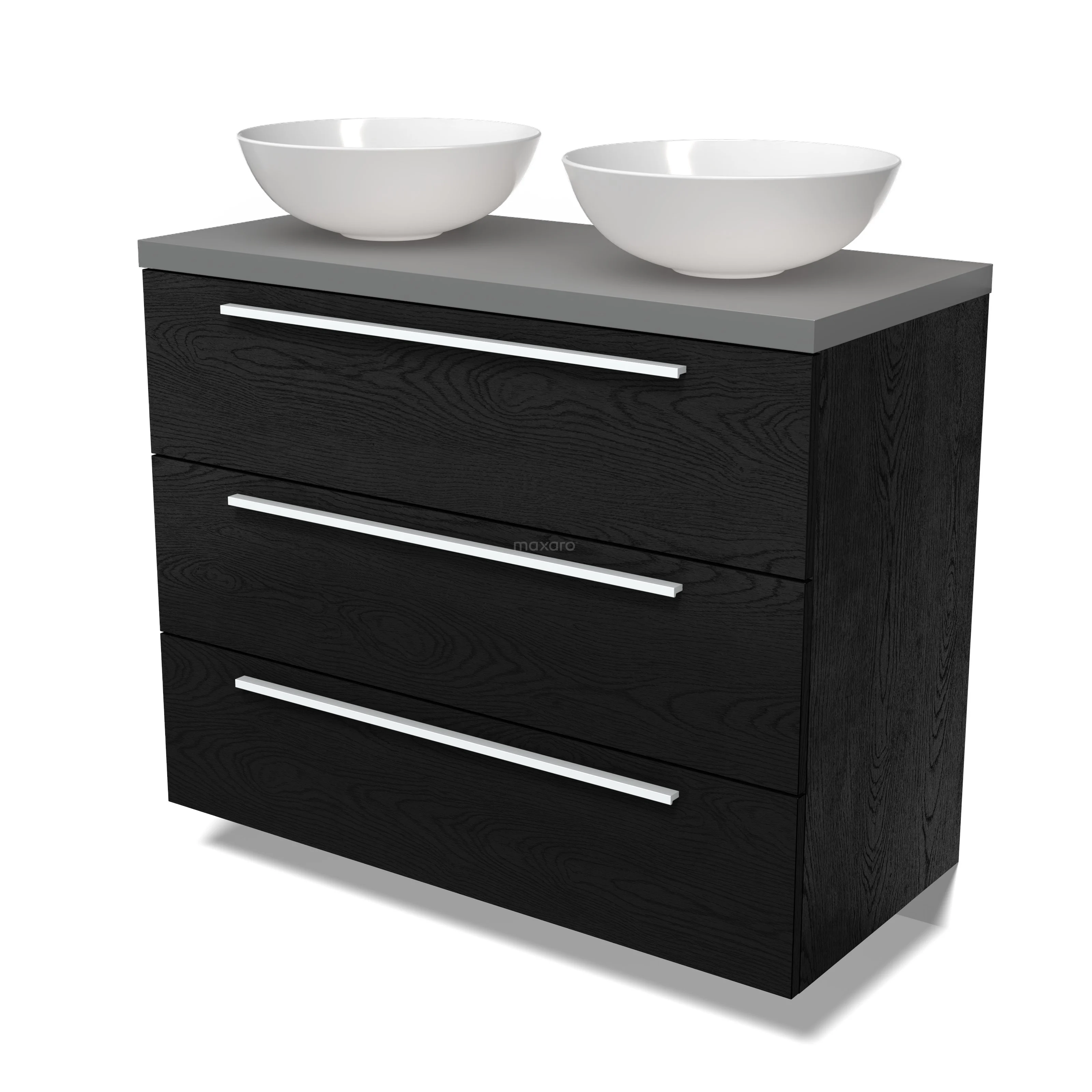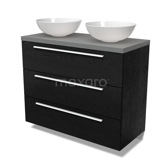 Modulo Plato Badmöbel mit Aufsatzwaschbecken | 100 cm Schwarze Eiche Flach front Mittelgrau blatt 3 Schubladen