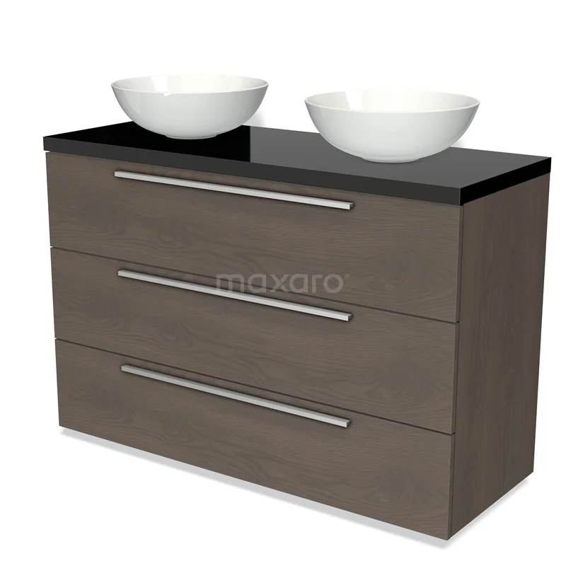Modulo Plato Badmöbel mit Aufsatzwaschbecken | 120 cm Dunkelbraune Eiche Flach front Hochglanz Schwarz blatt 3 Schubladen