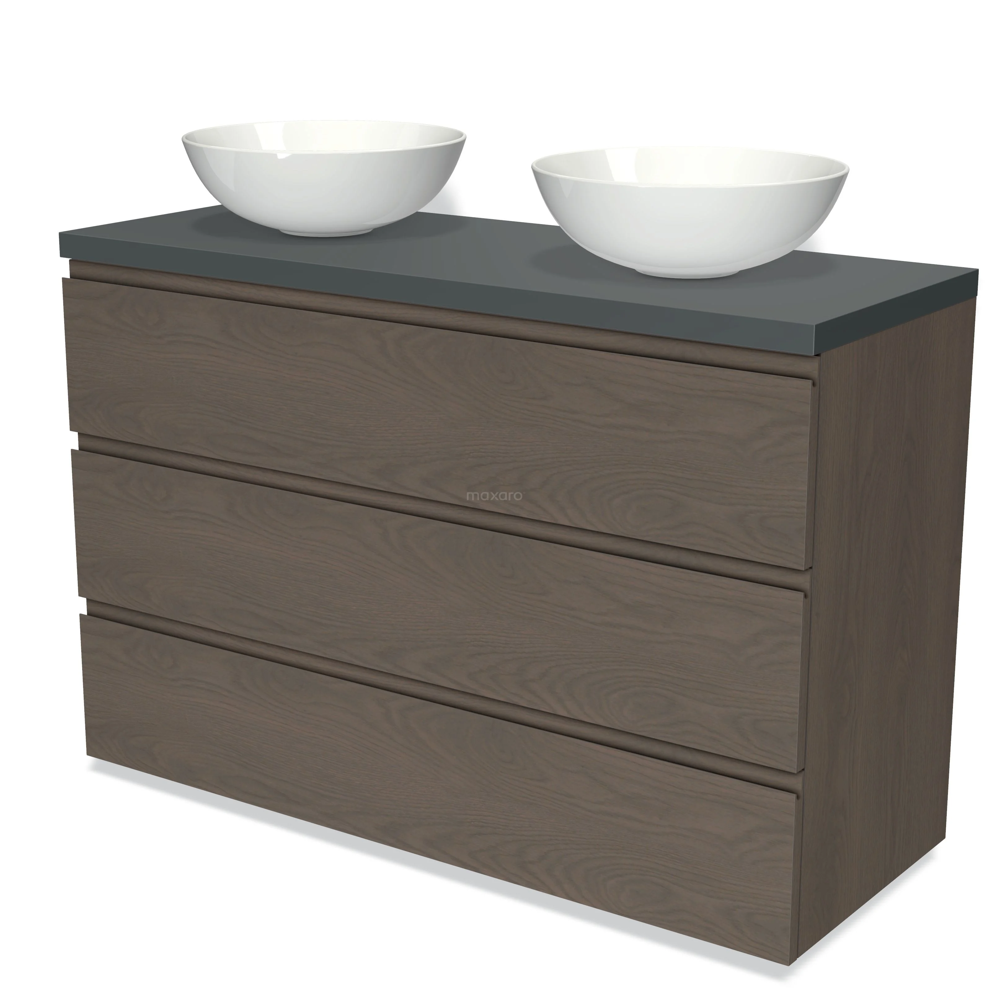 Modulo Plato Badmöbel mit Aufsatzwaschbecken | 120 cm Dunkelbraune Eiche Grifflos front Dunkelgrau blatt 3 Schubladen