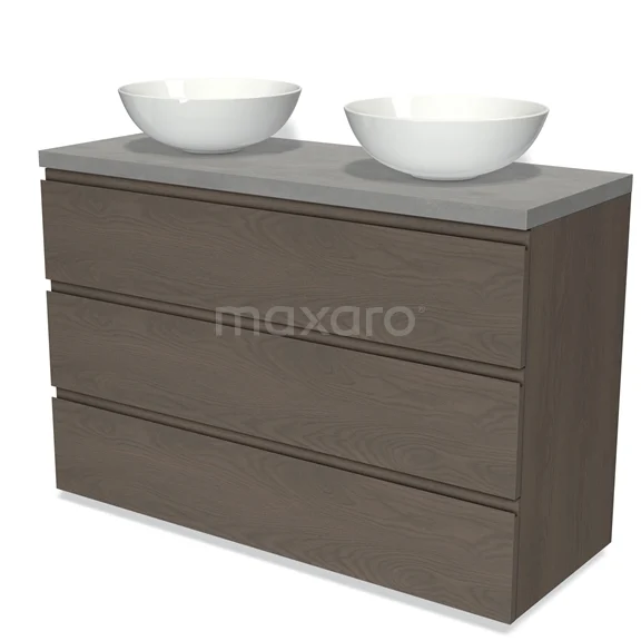 Modulo Plato Badmöbel mit Aufsatzwaschbecken | 120 cm Dunkelbraune Eiche Grifflos front Hellgrauer Beton blatt 3 Schubladen