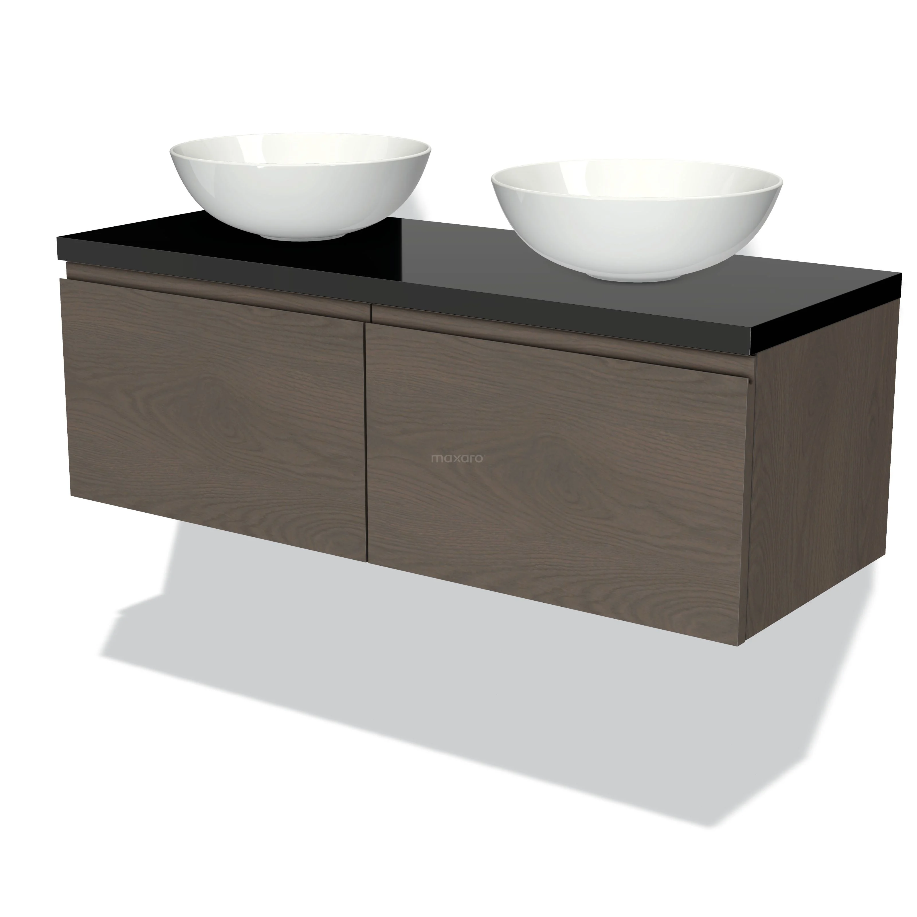 Modulo Plato Badmöbel mit Aufsatzwaschbecken | 120 cm Dunkelbraune Eiche Grifflos front Hochglanz Schwarz blatt 2 nebeneinanderliegende Schubladen