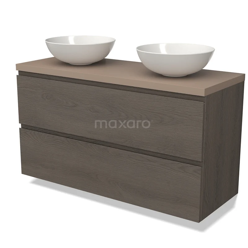 Modulo Plato Badmöbel mit Aufsatzwaschbecken | 120 cm Dunkelbraune Eiche Grifflos front Taupe blatt 2 übereinanderliegende Schubladen