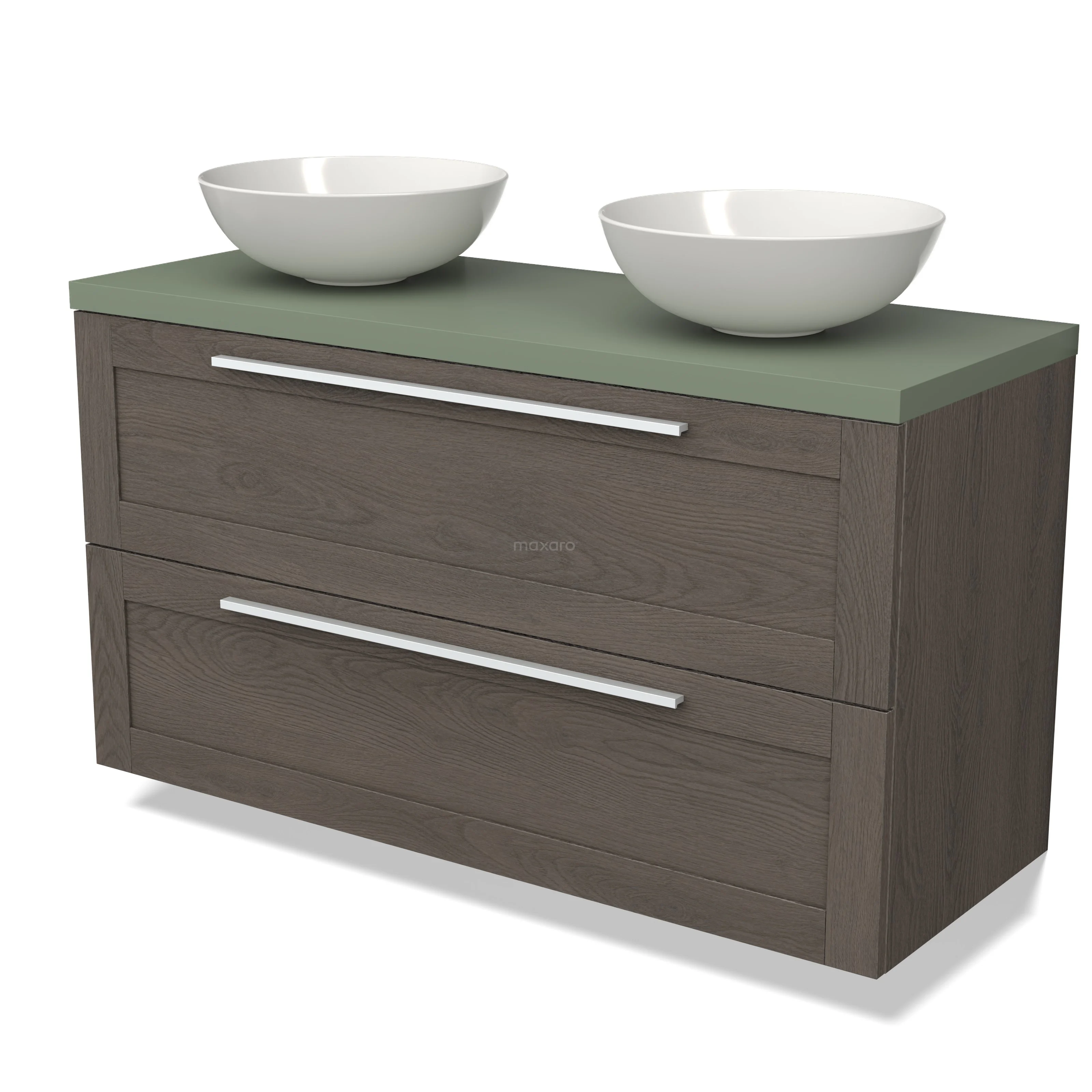Modulo Plato Badmöbel mit Aufsatzwaschbecken | 120 cm Dunkelbraune Eiche Rahmen front Salbeigrün blatt 2 übereinanderliegende Schubladen