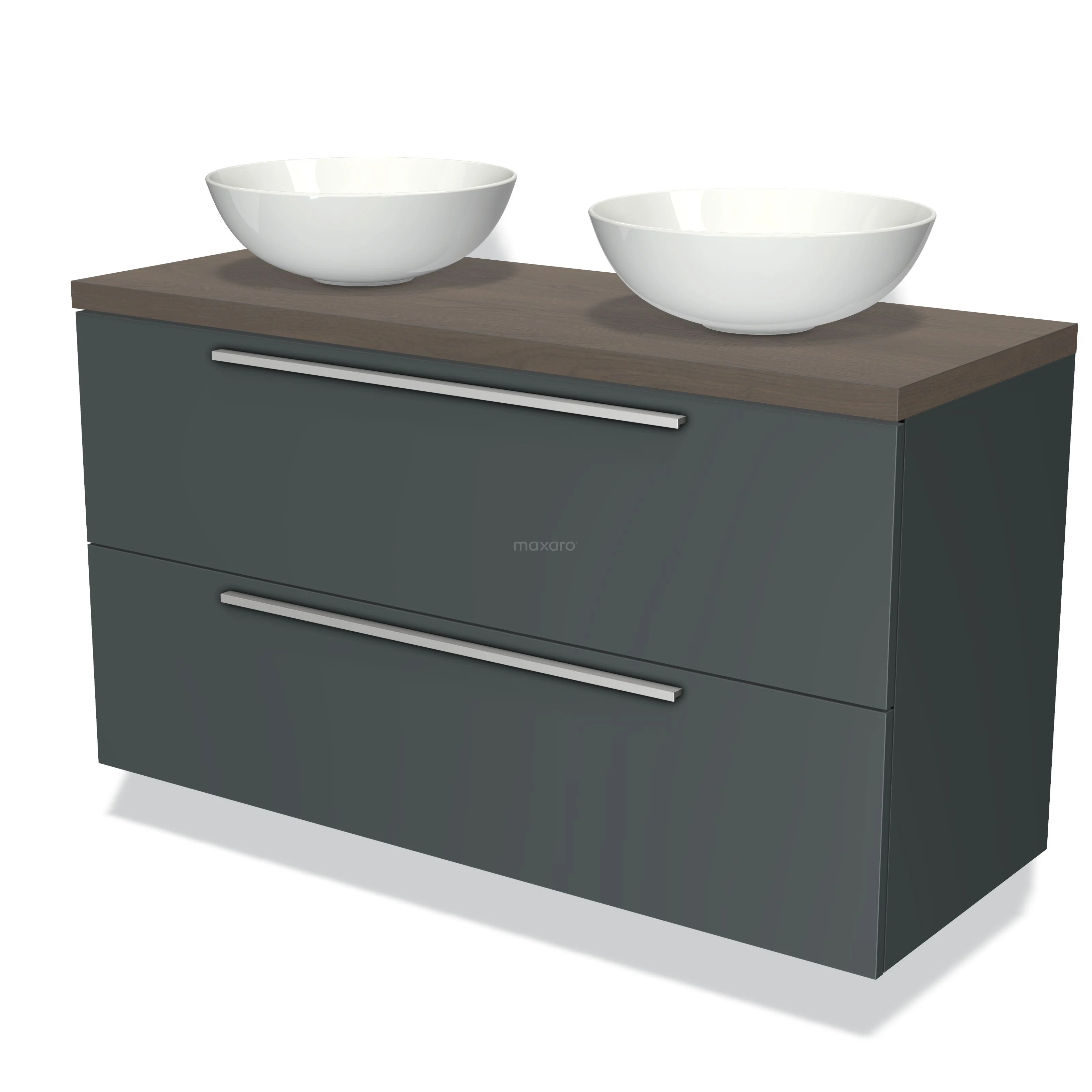 Modulo Plato Badmöbel mit Aufsatzwaschbecken | 120 cm Dunkelgrau Flach front Dunkelbraune Eiche blatt 2 übereinanderliegende Schubladen
