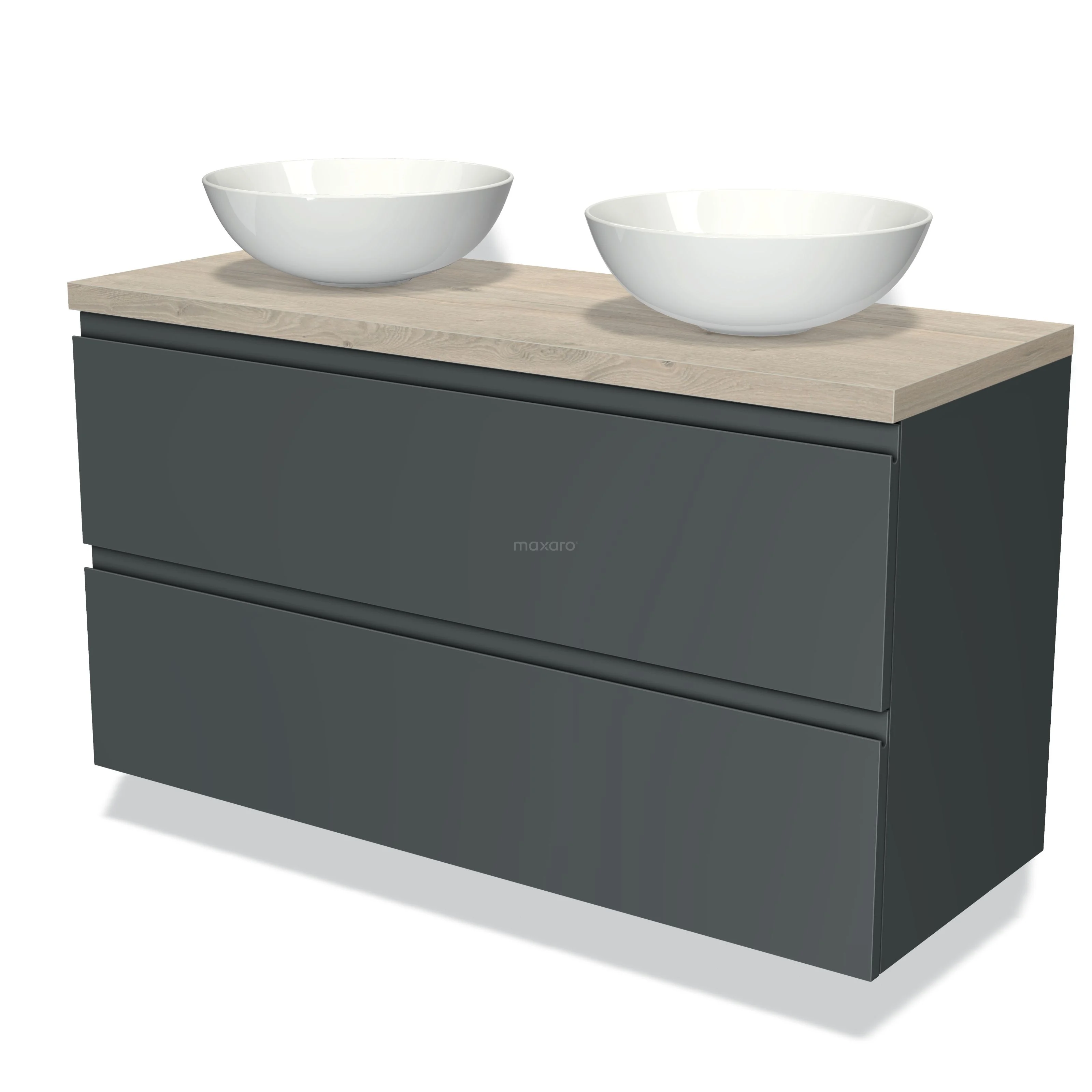 Modulo Plato Badmöbel mit Aufsatzwaschbecken | 120 cm Dunkelgrau Grifflos front Hellgraue Eiche blatt 2 übereinanderliegende Schubladen
