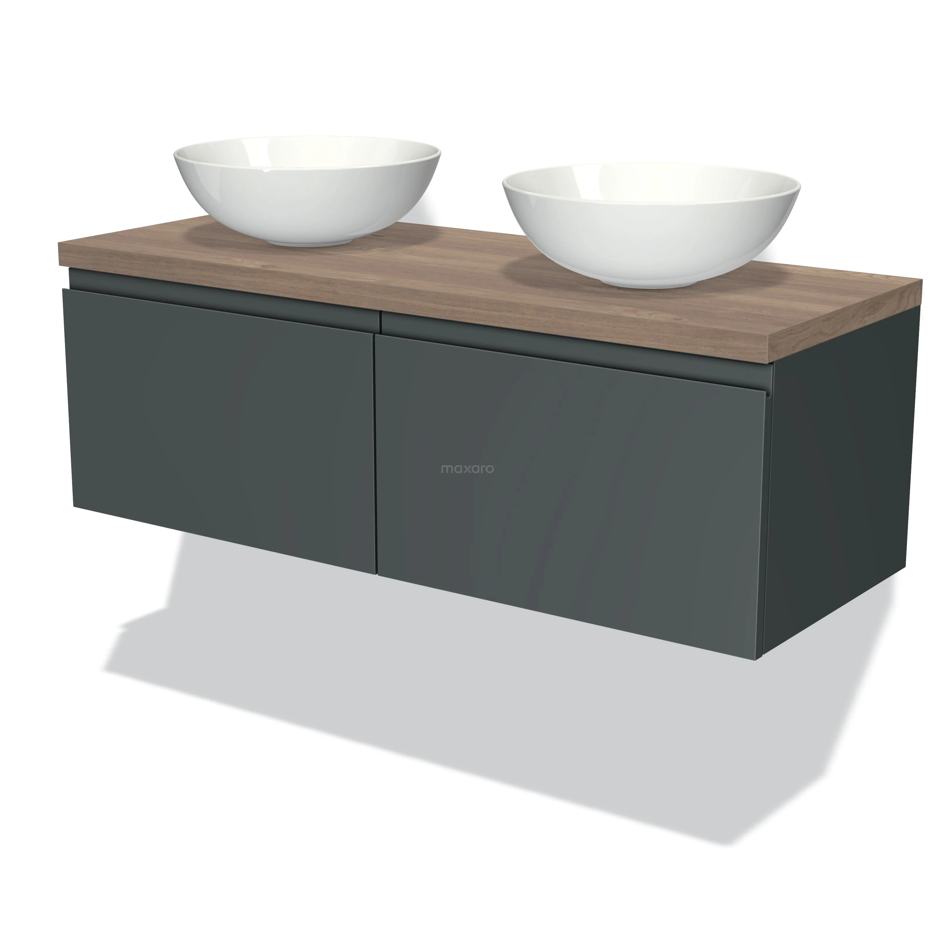 Modulo Plato Badmöbel mit Aufsatzwaschbecken | 120 cm Dunkelgrau Grifflos front Mittelbraune Eiche blatt 2 nebeneinanderliegende Schubladen