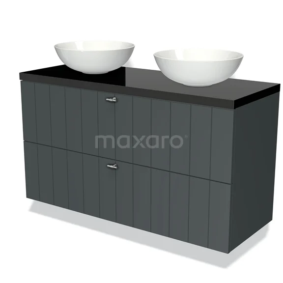 Modulo Plato Badmöbel mit Aufsatzwaschbecken | 120 cm Dunkelgrau Lamelle front Hochglanz Schwarz blatt 2 übereinanderliegende Schubladen