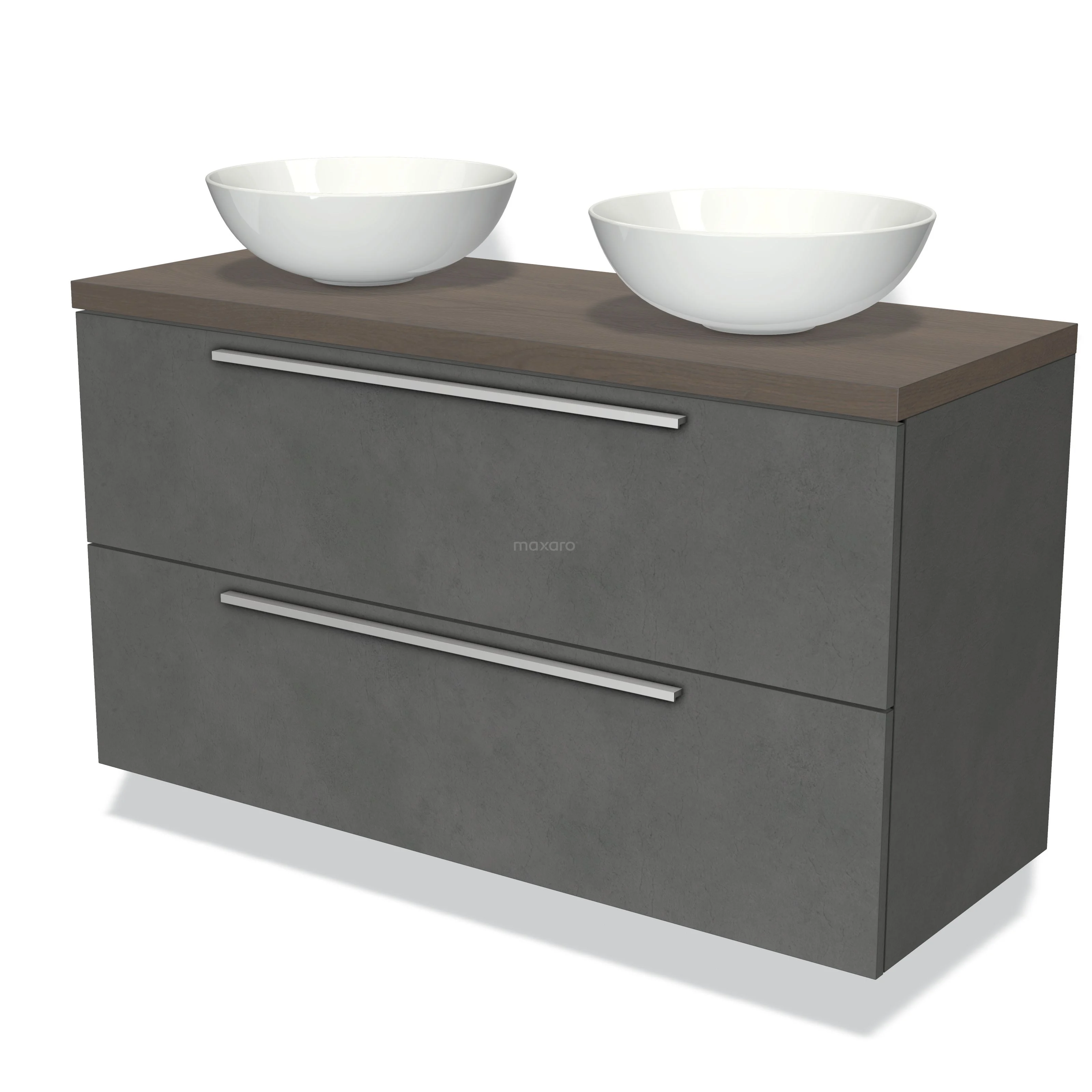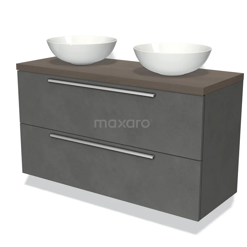 Modulo Plato Badmöbel mit Aufsatzwaschbecken | 120 cm Dunkelgrauer Beton Flach front Dunkelbraune Eiche blatt 2 übereinanderliegende Schubladen