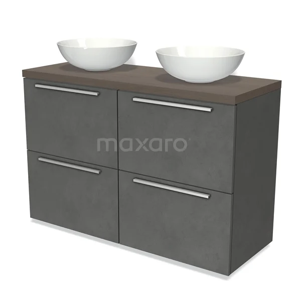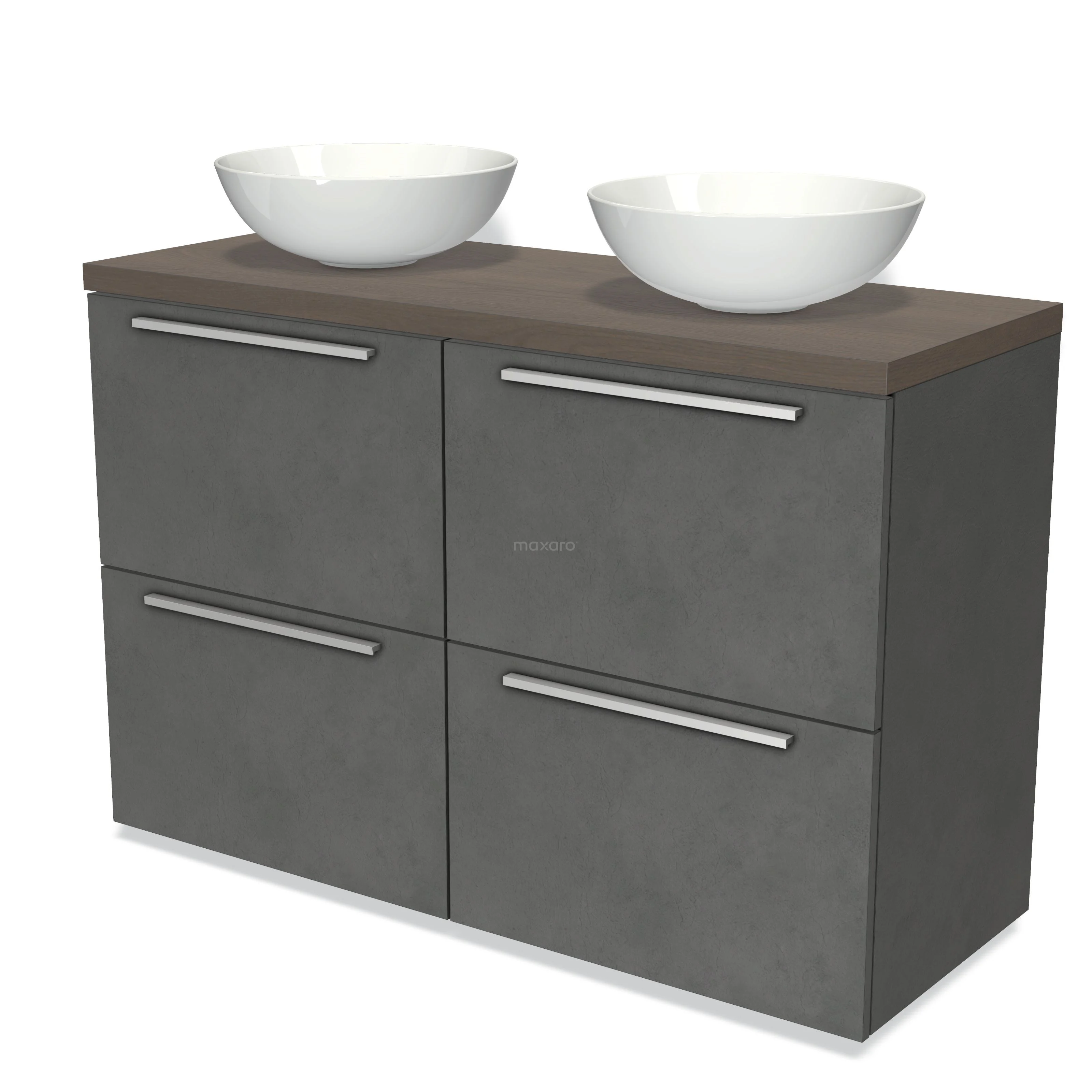 Modulo Plato Badmöbel mit Aufsatzwaschbecken | 120 cm Dunkelgrauer Beton Flach front Dunkelbraune Eiche blatt 4 hohe Schubladen