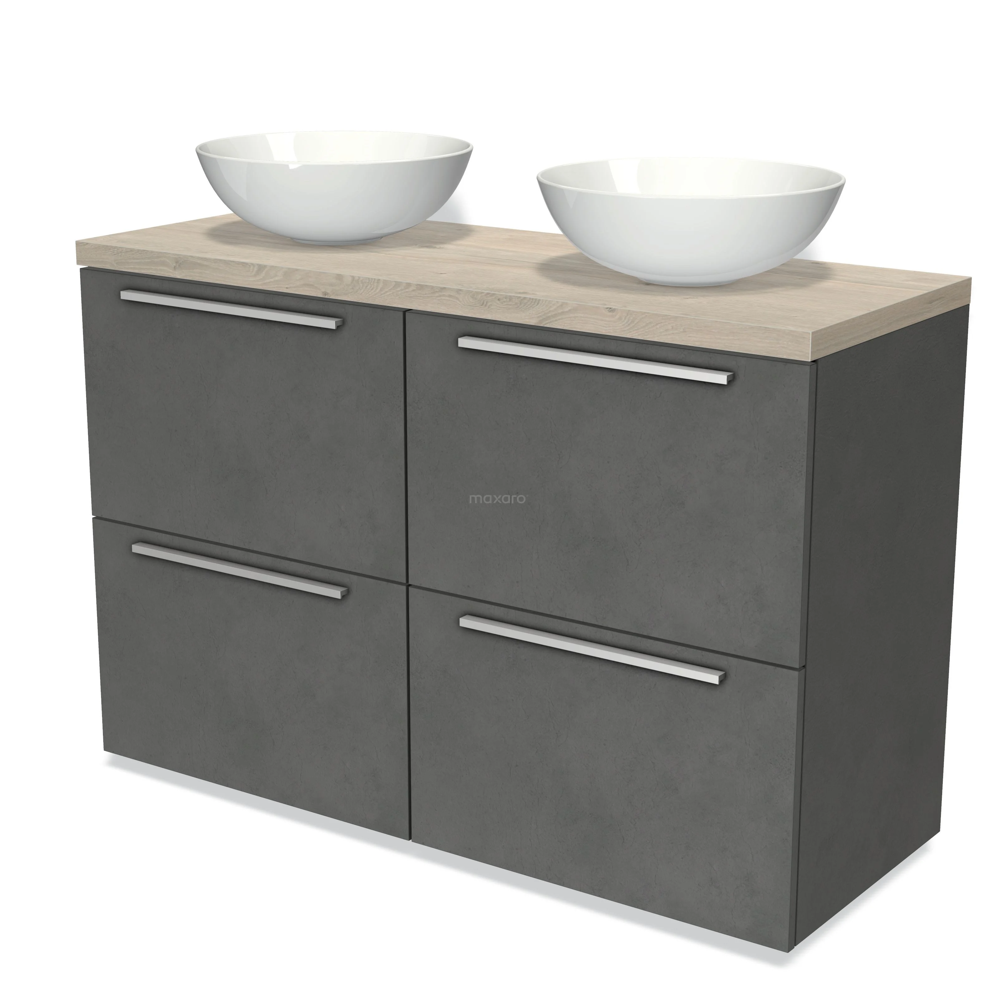 Modulo Plato Badmöbel mit Aufsatzwaschbecken | 120 cm Dunkelgrauer Beton Flach front Hellgraue Eiche blatt 4 hohe Schubladen