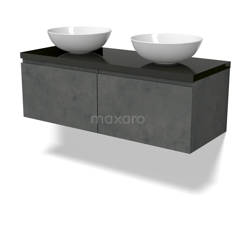 Modulo Plato Badmöbel mit Aufsatzwaschbecken | 120 cm Dunkelgrauer Beton Grifflos front Hochglanz Schwarz blatt 2 nebeneinanderliegende Schubladen