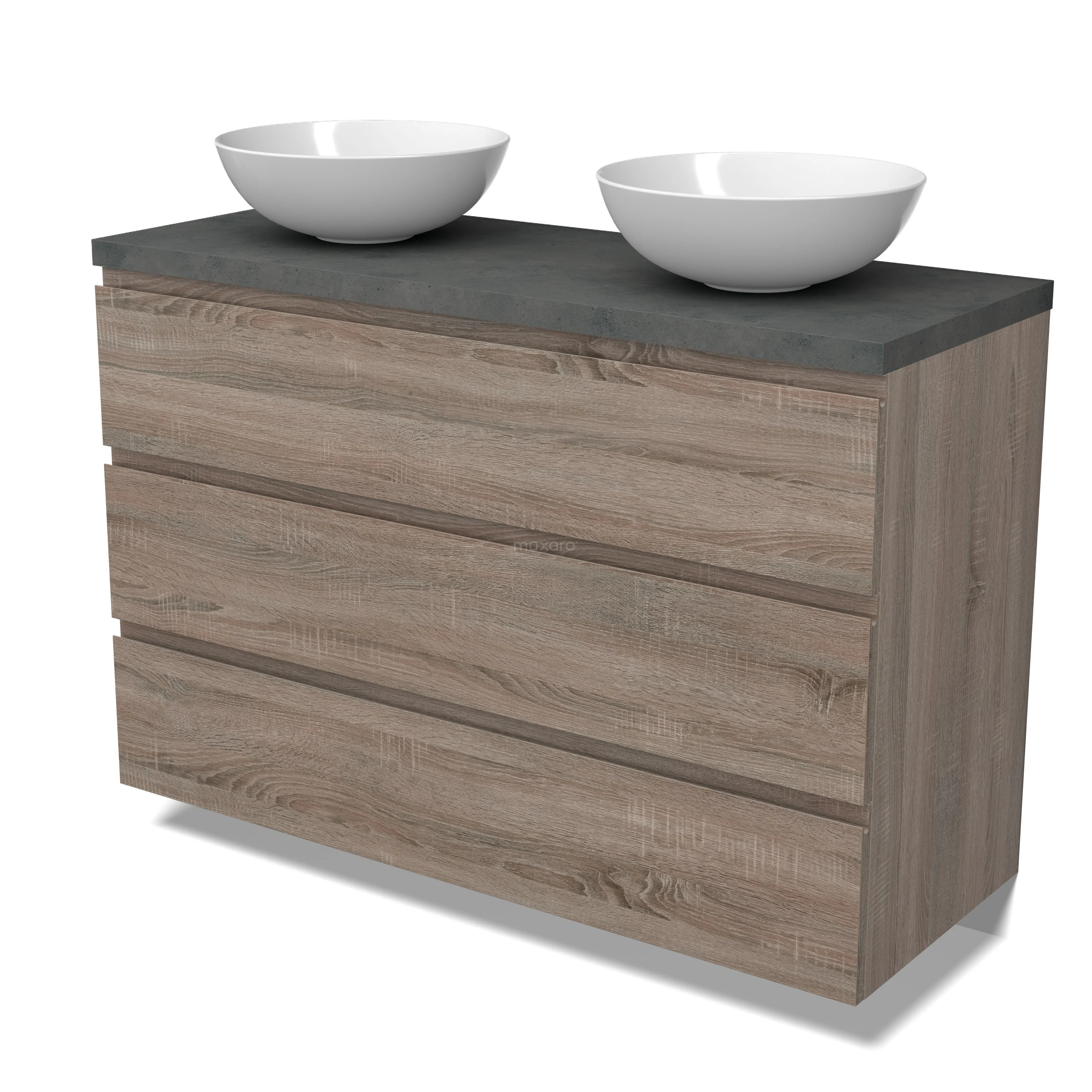 Modulo Plato Badmöbel mit Aufsatzwaschbecken | 120 cm Eiche Grifflos front Dunkelgrauer Beton blatt 3 Schubladen