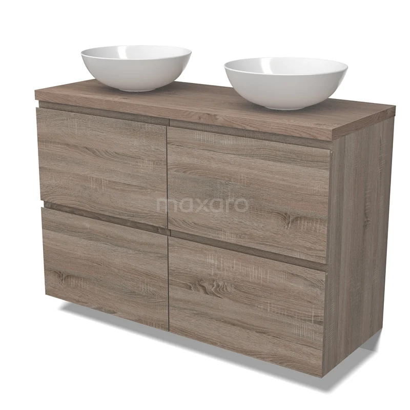 Modulo Plato Badmöbel mit Aufsatzwaschbecken | 120 cm Eiche Grifflos front Mittelbraune Eiche blatt 4 hohe Schubladen