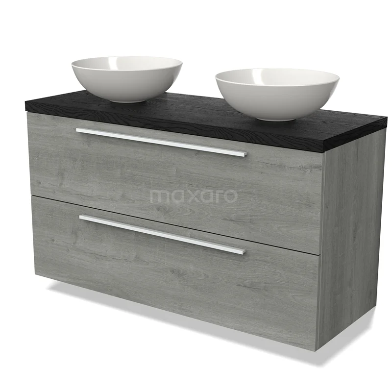 Modulo Plato Badmöbel mit Aufsatzwaschbecken | 120 cm Graue Eiche Flach front Schwarze Eiche blatt 2 übereinanderliegende Schubladen