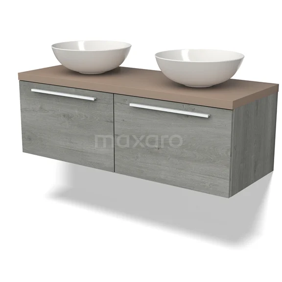 Modulo Plato Badmöbel mit Aufsatzwaschbecken | 120 cm Graue Eiche Flach front Taupe blatt 2 nebeneinanderliegende Schubladen