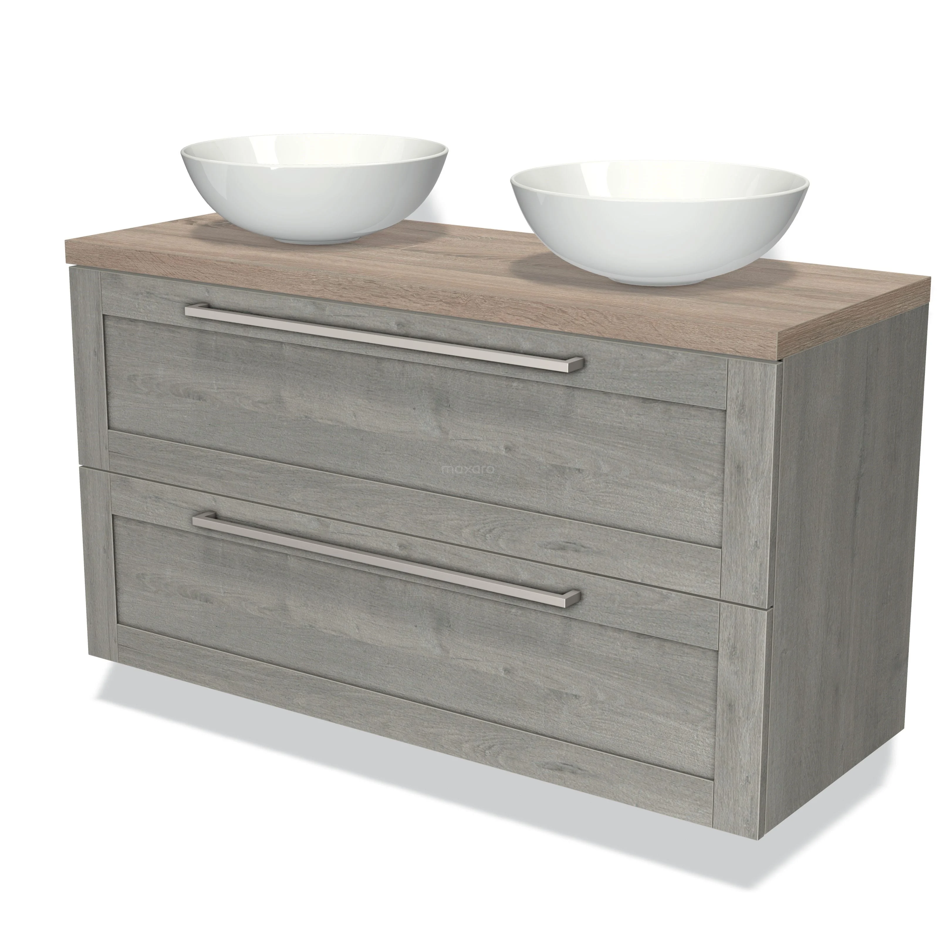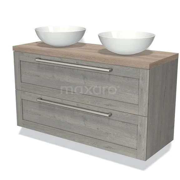 Modulo Plato Badmöbel mit Aufsatzwaschbecken | 120 cm Graue Eiche Rahmen front Eiche blatt 2 übereinanderliegende Schubladen