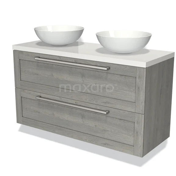 Modulo Plato Badmöbel mit Aufsatzwaschbecken | 120 cm Graue Eiche Rahmen front Hochglanz Weiß blatt 2 übereinanderliegende Schubladen