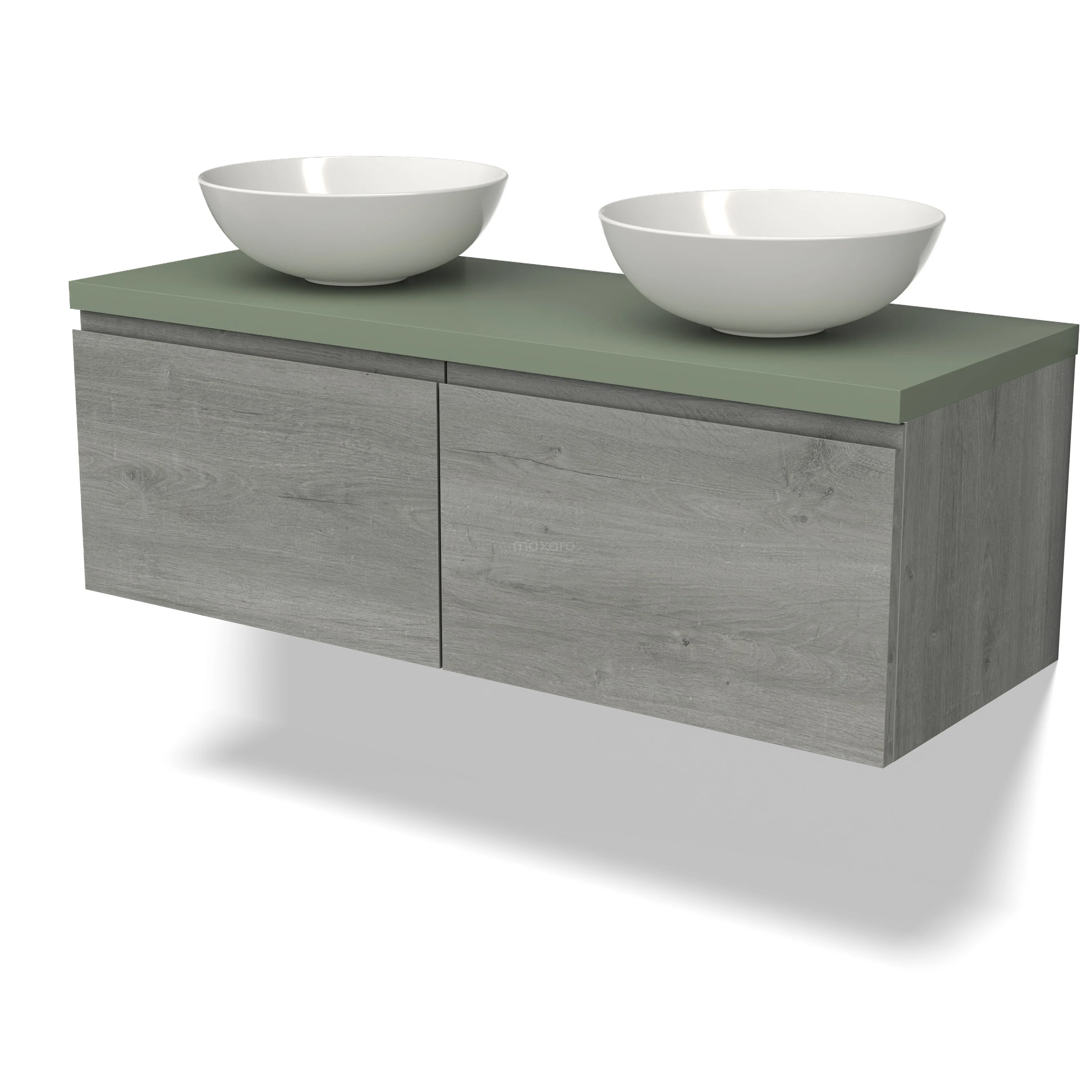 Modulo Plato Badmöbel mit Aufsatzwaschbecken | 120 cm Graue Eiche Rahmen front Salbeigrün blatt 2 nebeneinanderliegende Schubladen