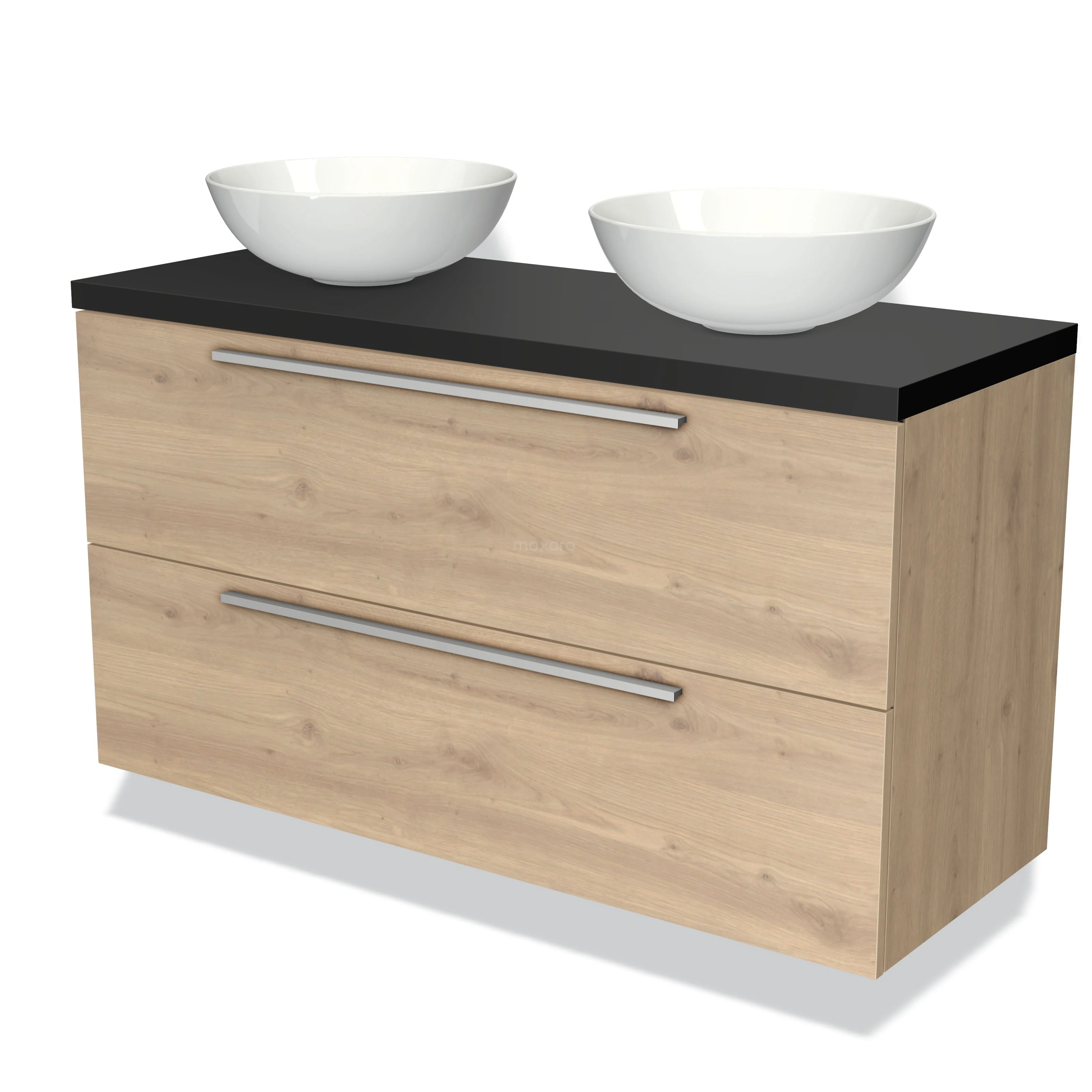 Modulo Plato Badmöbel mit Aufsatzwaschbecken | 120 cm Hellbraune Eiche Flach front Matt Schwarz blatt 2 übereinanderliegende Schubladen