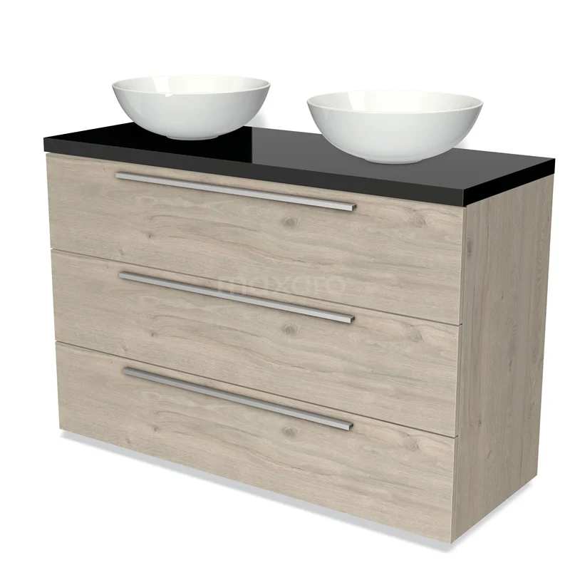 Modulo Plato Badmöbel mit Aufsatzwaschbecken | 120 cm Hellgraue Eiche Flach front Hochglanz Schwarz blatt 3 Schubladen