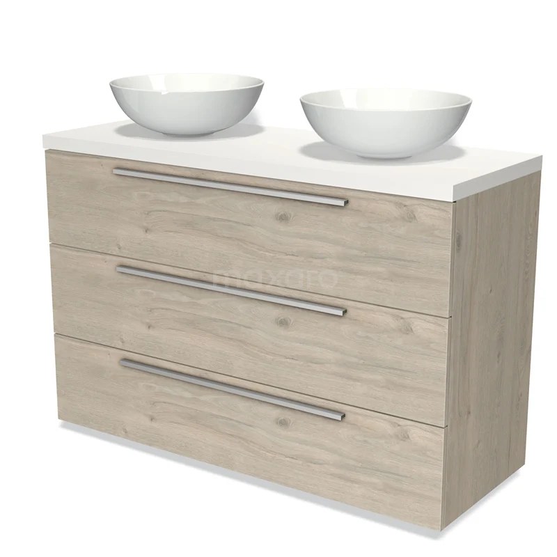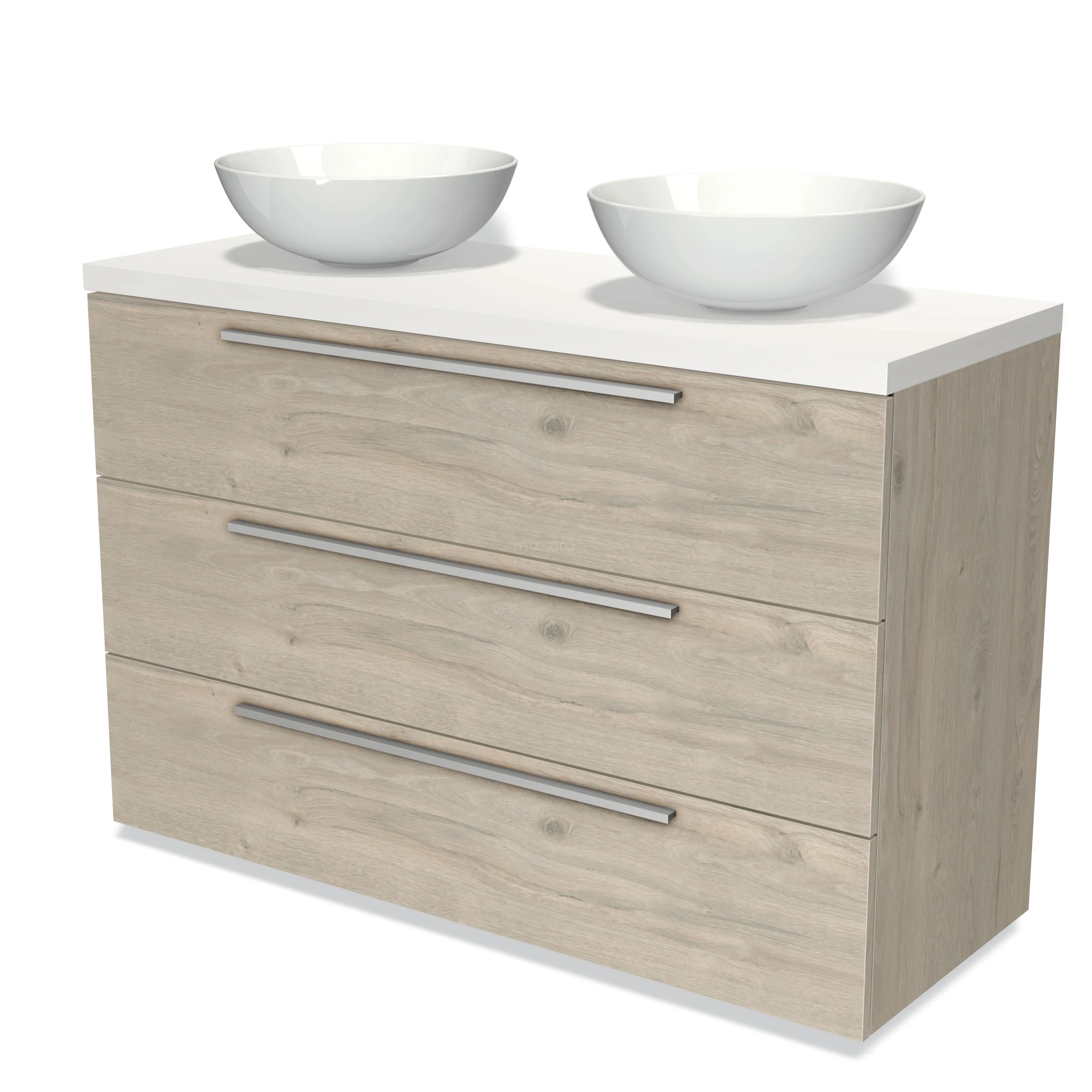 Modulo Plato Badmöbel mit Aufsatzwaschbecken | 120 cm Hellgraue Eiche Flach front Matt Weiß blatt 3 Schubladen