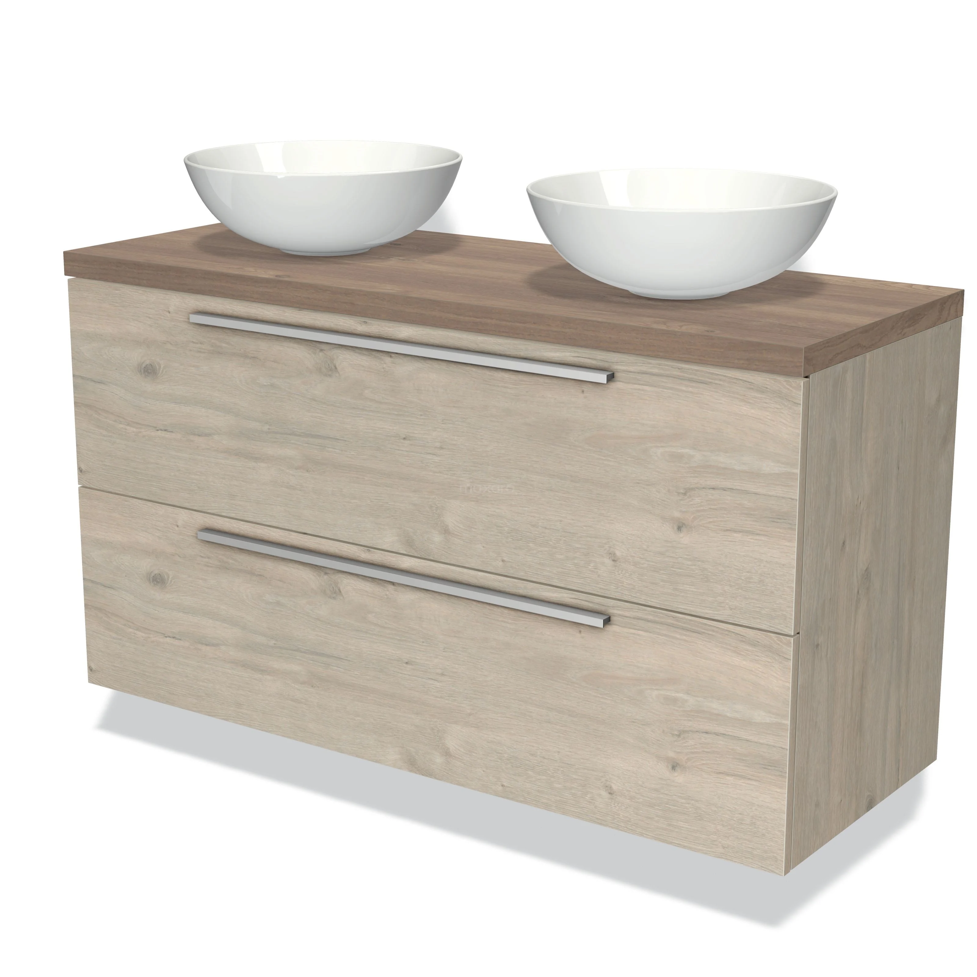 Modulo Plato Badmöbel mit Aufsatzwaschbecken | 120 cm Hellgraue Eiche Flach front Mittelbraune Eiche blatt 2 übereinanderliegende Schubladen