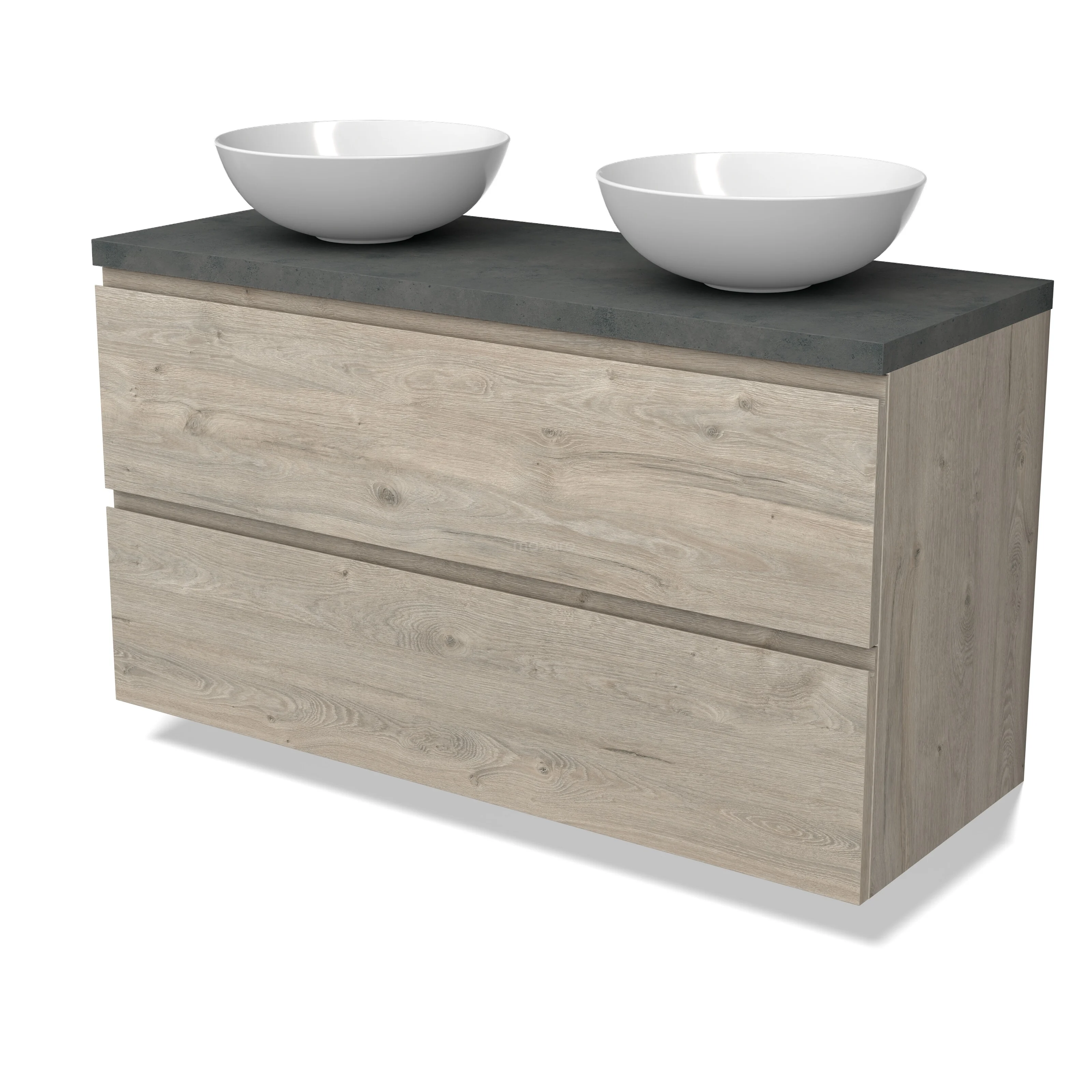 Modulo Plato Badmöbel mit Aufsatzwaschbecken | 120 cm Hellgraue Eiche Grifflos front Dunkelgrauer Beton blatt 2 übereinanderliegende Schubladen