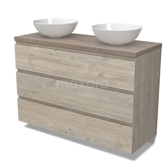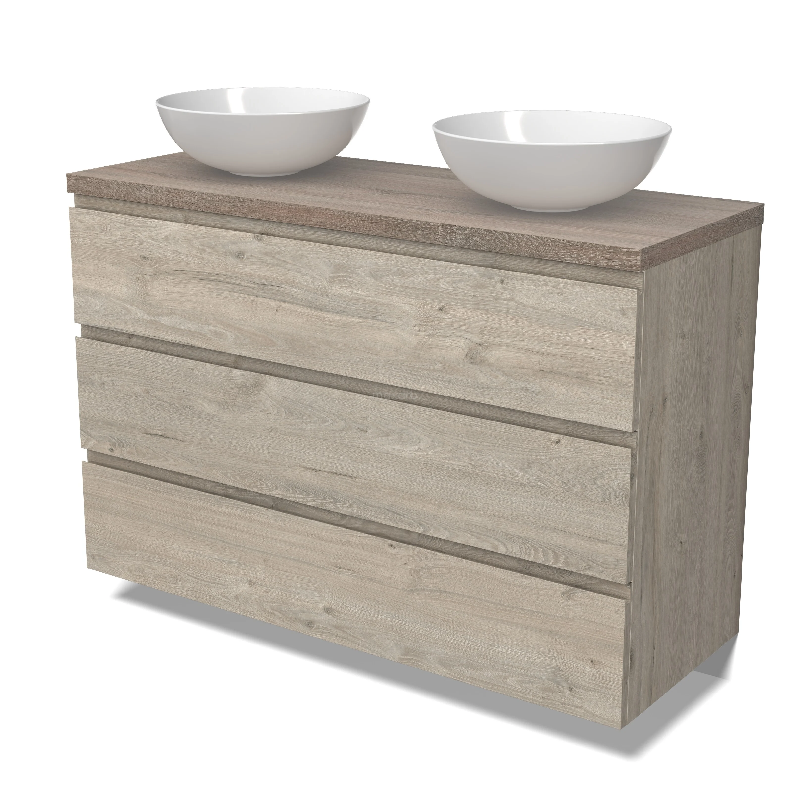 Modulo Plato Badmöbel mit Aufsatzwaschbecken | 120 cm Hellgraue Eiche Grifflos front Eiche blatt 3 Schubladen