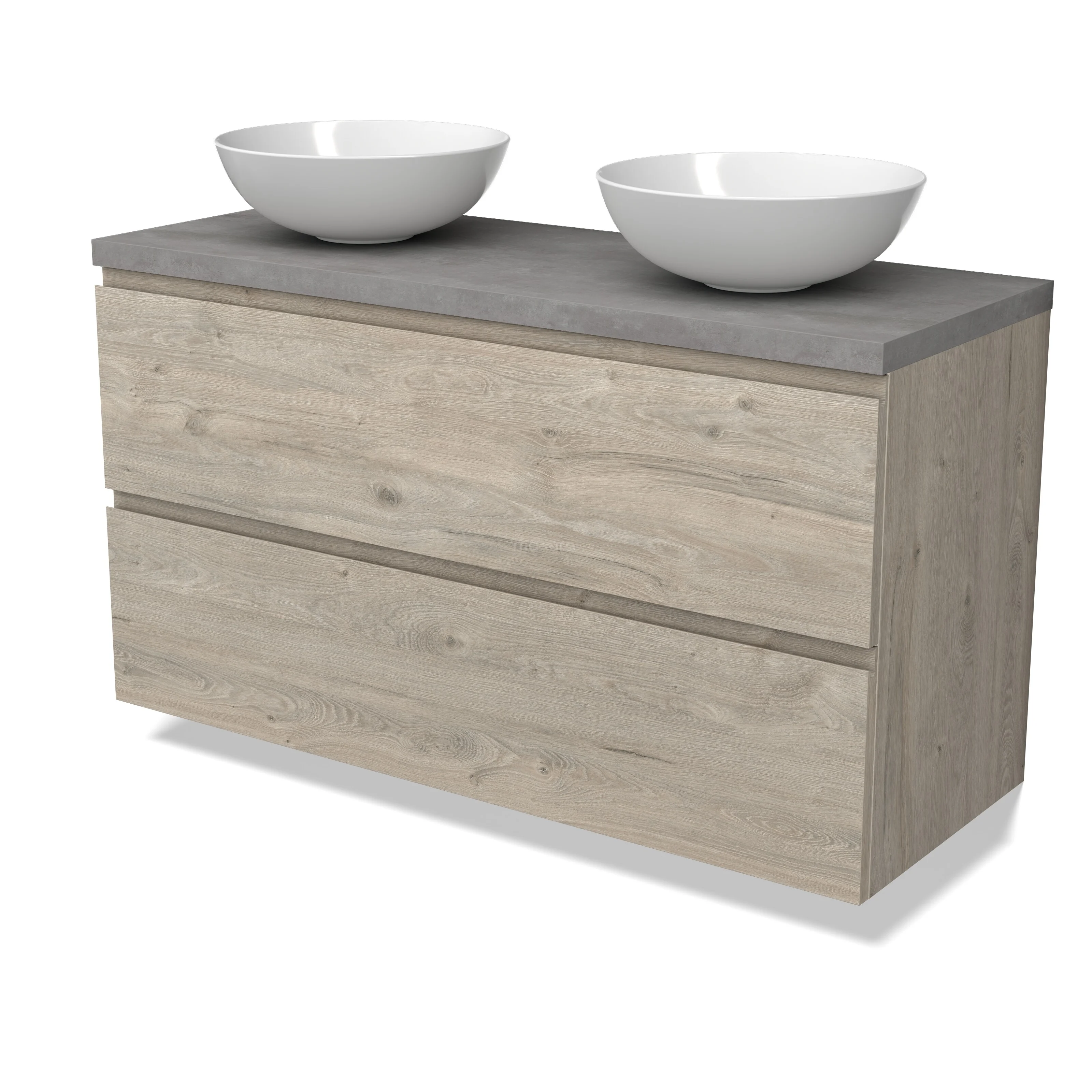 Modulo Plato Badmöbel mit Aufsatzwaschbecken | 120 cm Hellgraue Eiche Grifflos front Hellgrauer Beton blatt 2 übereinanderliegende Schubladen