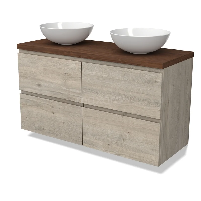 Modulo Plato Badmöbel mit Aufsatzwaschbecken | 120 cm Hellgraue Eiche Grifflos front Walnuss blatt 4 Schubladen