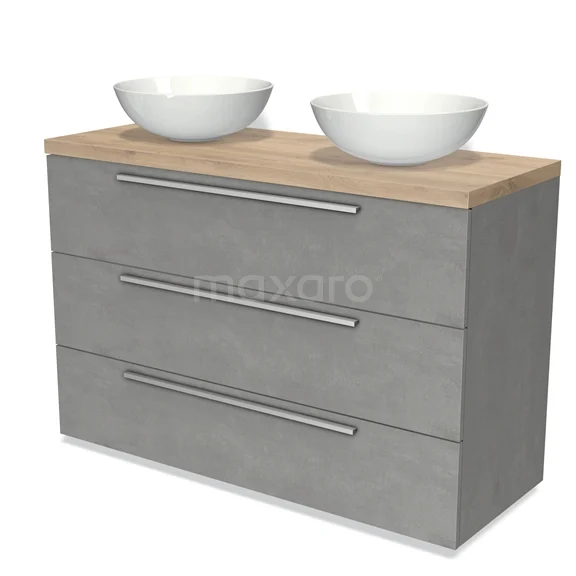 Modulo Plato Badmöbel mit Aufsatzwaschbecken | 120 cm Hellgrauer Beton Flach front Hellbraune Eiche blatt 3 Schubladen