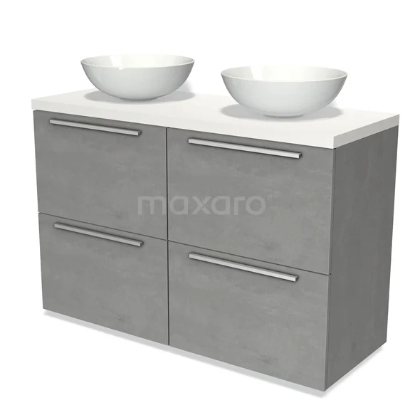 Modulo Plato Badmöbel mit Aufsatzwaschbecken | 120 cm Hellgrauer Beton Flach front Matt Weiß blatt 4 hohe Schubladen