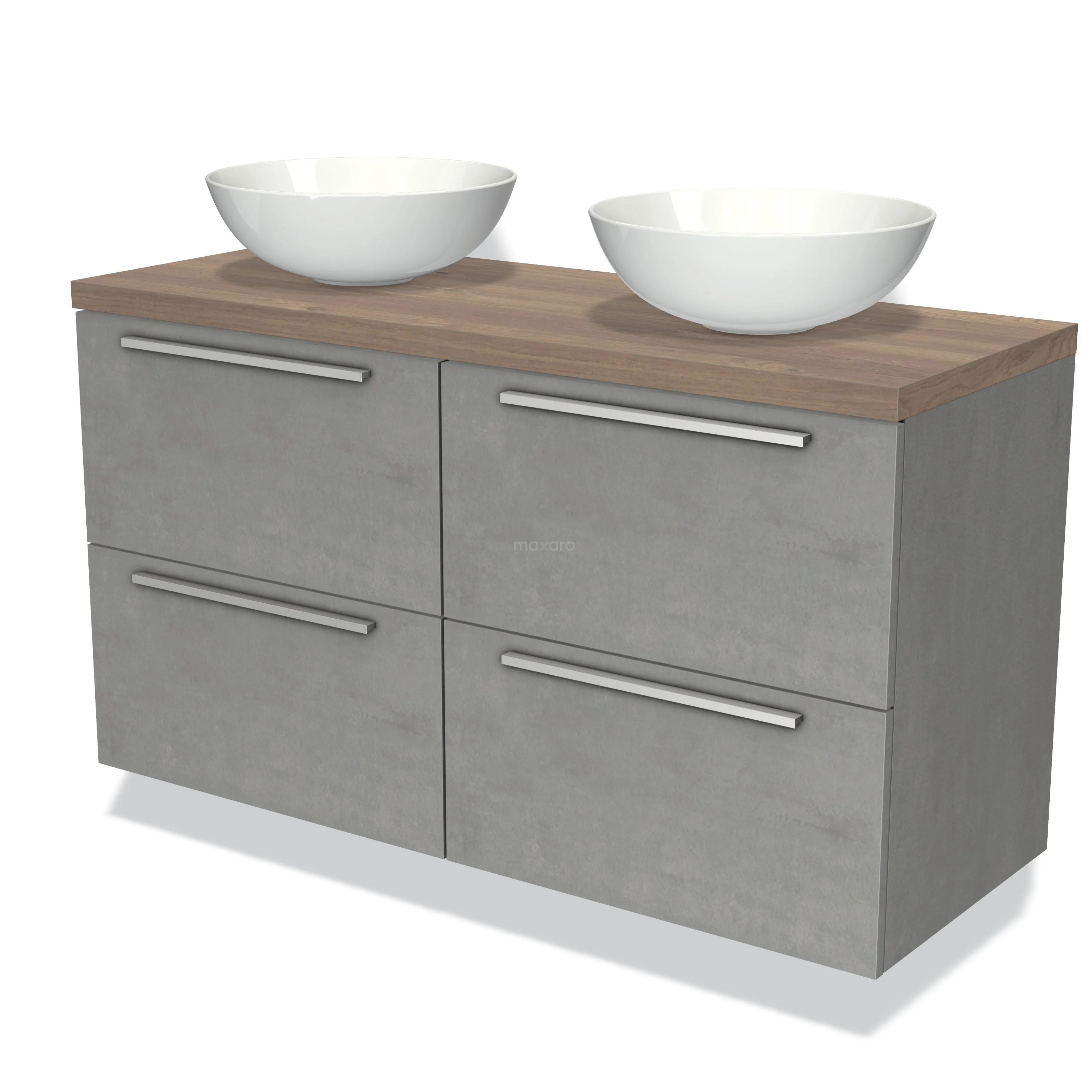 Modulo Plato Badmöbel mit Aufsatzwaschbecken | 120 cm Hellgrauer Beton Flach front Mittelbraune Eiche blatt 4 Schubladen