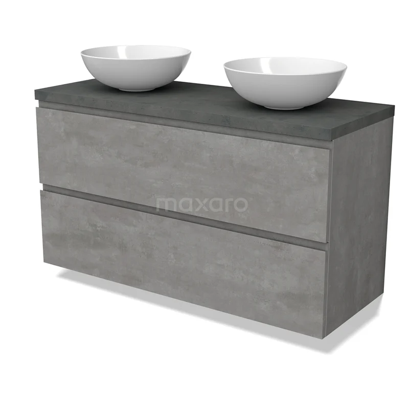 Modulo Plato Badmöbel mit Aufsatzwaschbecken | 120 cm Hellgrauer Beton Grifflos front Dunkelgrauer Beton blatt 2 übereinanderliegende Schubladen