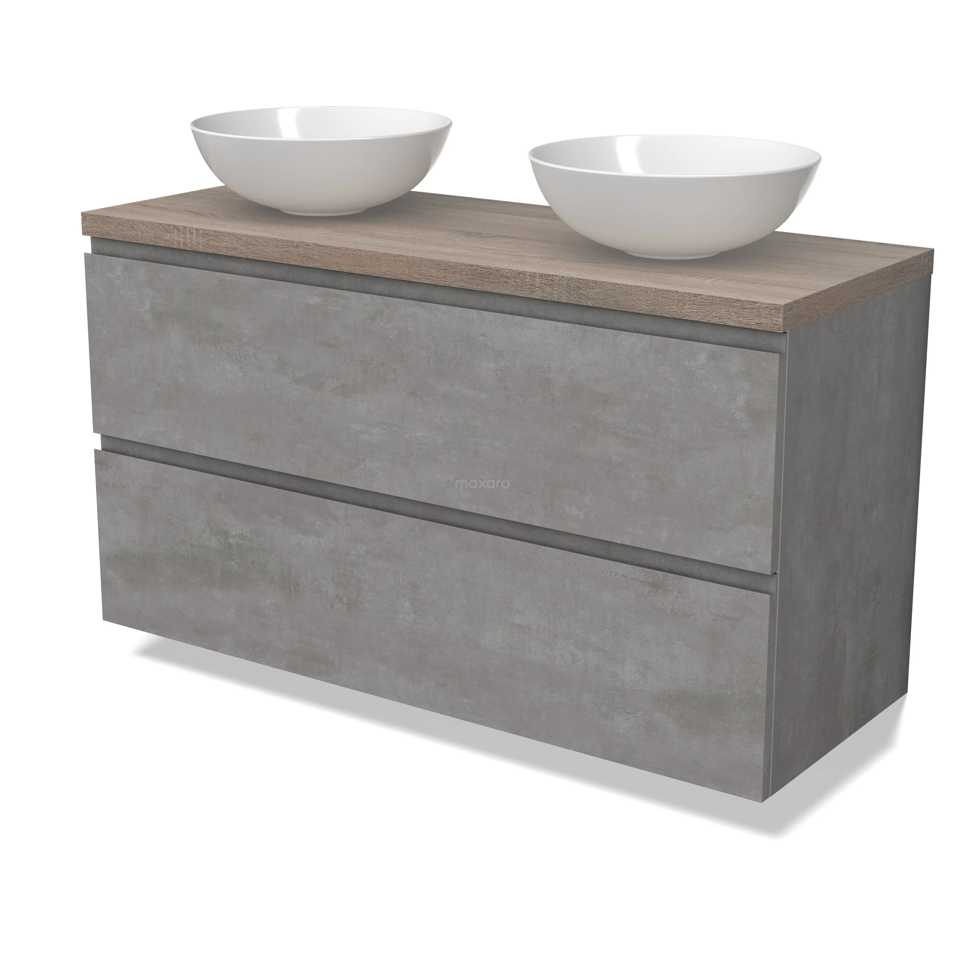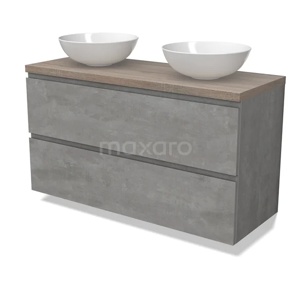Modulo Plato Badmöbel mit Aufsatzwaschbecken | 120 cm Hellgrauer Beton Grifflos front Eiche blatt 2 übereinanderliegende Schubladen