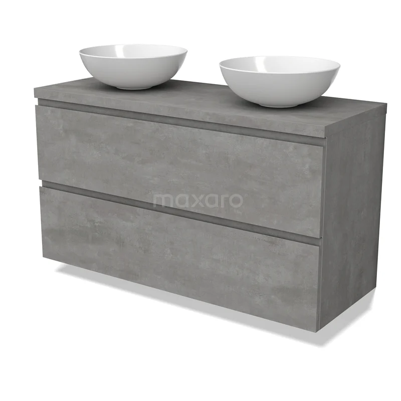 Modulo Plato Badmöbel mit Aufsatzwaschbecken | 120 cm Hellgrauer Beton Grifflos front Hellgrauer Beton blatt 2 übereinanderliegende Schubladen