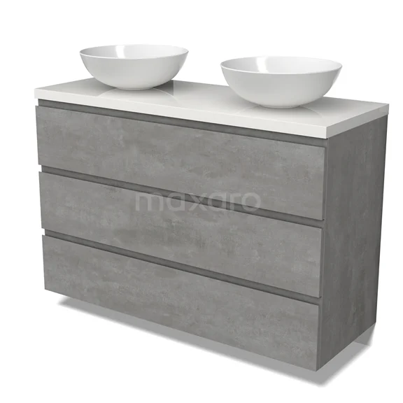 Modulo Plato Badmöbel mit Aufsatzwaschbecken | 120 cm Hellgrauer Beton Grifflos front Hochglanz Weiß blatt 3 Schubladen