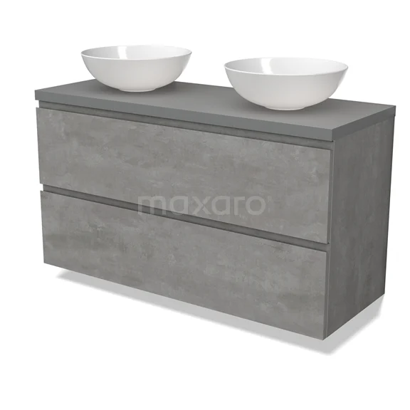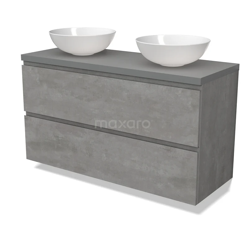 Modulo Plato Badmöbel mit Aufsatzwaschbecken | 120 cm Hellgrauer Beton Grifflos front Mittelgrau blatt 2 übereinanderliegende Schubladen